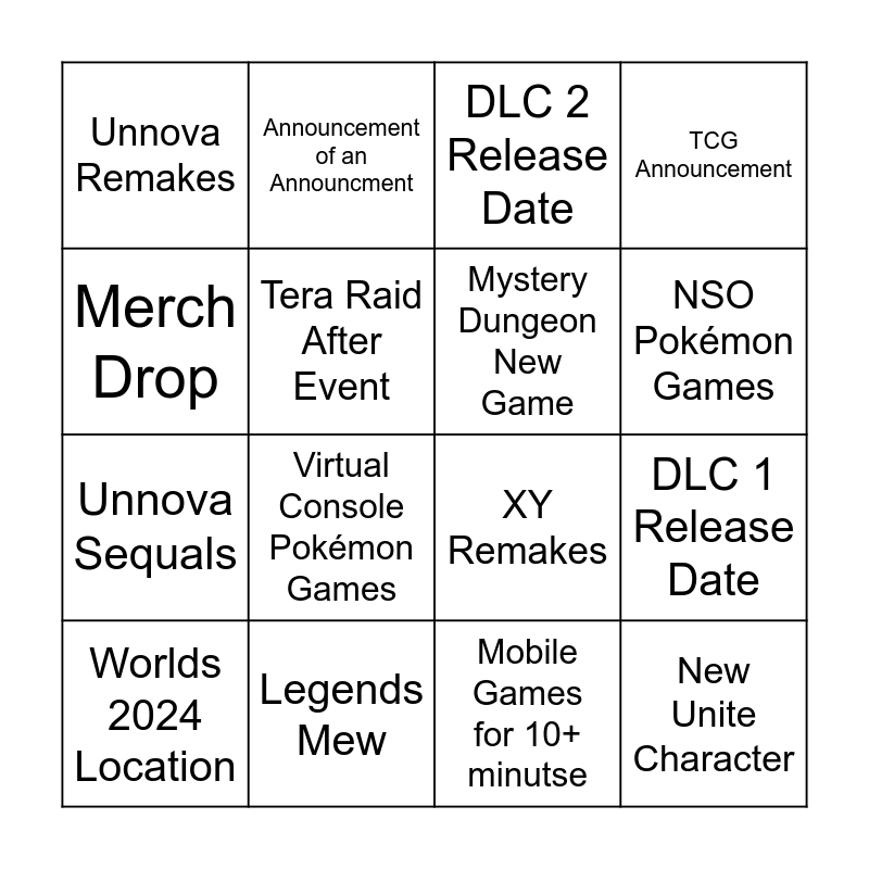 This bingo card has 16 words: Legends Mew, DLC 1 Release Date, DLC 2 Release Date, Unnova Remakes, Unnova Sequals, Announcement of an Announcment, XY Remakes, Mobile Games for 10+ minutse, Merch Drop, Tera Raid After Event, Worlds 2024 Location, TCG Announcement, Virtual Console Pokémon Games, NSO Pokémon Games, Mystery Dungeon New Game and New Unite Character.
