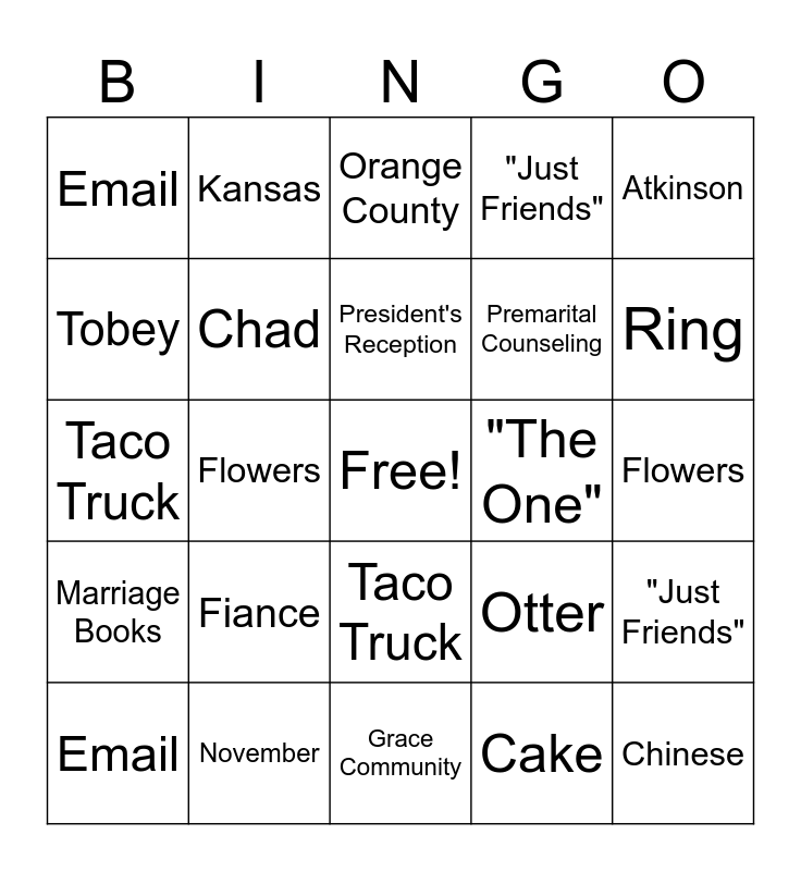 ⚠ This card has duplicate items: Santa Monica (2), Beach (2), Orange County (2), Grace Community (2), November (2), Evangelism Ministry (2), October (2), Propose (2), Email (2), Joanne (2), Fiance (2), Blue (2), President's Reception (2), Tobey (2), Wedding Dress (2), Flowers (2), Evie (2), Ring (2), Descanso Gardens (2), Taco Truck (2), Chad (2), Kansas (2), "Just Friends" (2), Premarital Counseling (2), Chinese (2), Pasadena City Hall (2), "The One" (2), Nathan (2), Prayer (2), Atkinson (2), Otter (2), Godly (2), Van Nuys (2), Easter (2), Cake (2), Photographer (2)