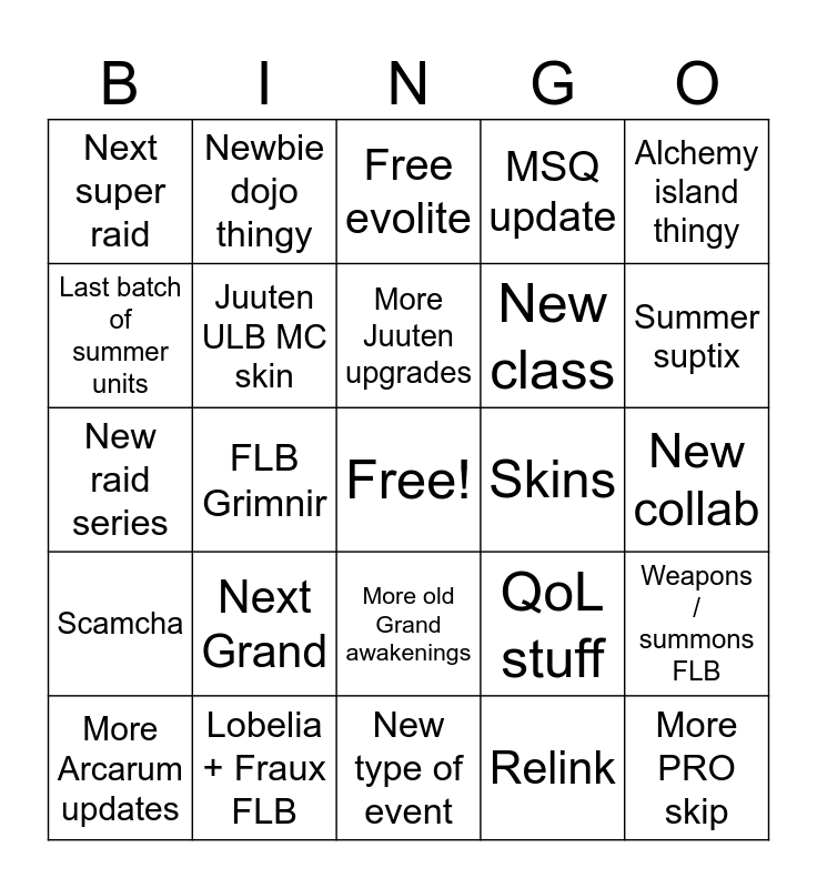 This bingo card has a free space and 24 words: Next Grand, Lobelia + Fraux FLB, More Juuten upgrades, More Arcarum updates, Alchemy island thingy, Next super raid, Last batch of summer units, Newbie dojo thingy, Skins, More old Grand awakenings, New class, New raid series, QoL stuff, Weapons / summons FLB, Juuten ULB MC skin, Relink, New collab, Free evolite, Summer suptix, FLB Grimnir, More PRO skip, Scamcha, MSQ update and New type of event.