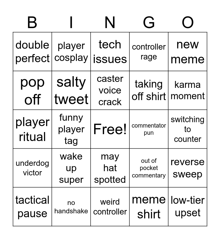 This bingo card has a free space and 24 words: wake up super, no handshake, caster voice crack, tactical pause, new meme, double perfect, pop off, player cosplay, commentator pun, may hat spotted, taking off shirt, player ritual, out of pocket commentary, reverse sweep, salty tweet, meme shirt, switching to counter, tech issues, karma moment, funny player tag, low-tier upset, underdog victor, controller rage and weird controller.