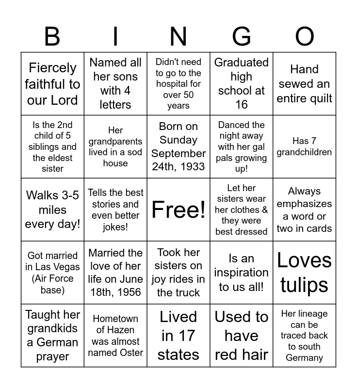 This bingo card has a free space and 24 words: Married the love of her life on June 18th, 1956, Hometown of Hazen was almost named Oster, Born on Sunday September 24th, 1933, Taught her grandkids a German prayer, Hand sewed an entire quilt, Fiercely faithful to our Lord, Is the 2nd child of 5 siblings and the eldest sister, Named all her sons with 4 letters, Let her sisters wear her clothes & they were best dressed, Took her sisters on joy rides in the truck, Danced the night away with her gal pals growing up!, Walks 3-5 miles every day!, Is an inspiration to us all!, Loves tulips, Her grandparents lived in a sod house, Used to have red hair, Always emphasizes a word or two in cards, Didn't need to go to the hospital for over 50 years, Has 7 grandchildren, Tells the best stories and even better jokes!, Her lineage can be traced back to south Germany, Got married in Las Vegas (Air Force base), Graduated high school at 16 and Lived in 17 states.