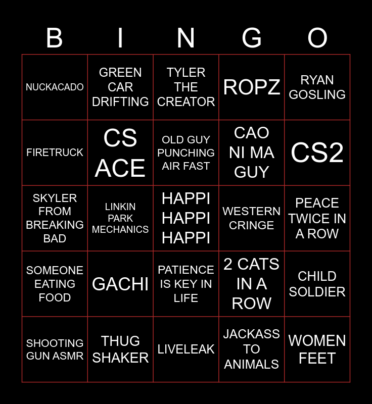 This bingo card has a free space and 24 words: GACHI, THUG SHAKER, OLD GUY PUNCHING AIR FAST, SHOOTING GUN ASMR, RYAN GOSLING, NUCKACADO, FIRETRUCK, GREEN CAR DRIFTING, WESTERN CRINGE, PATIENCE IS KEY IN LIFE, CAO NI MA GUY, SKYLER FROM BREAKING BAD, 2 CATS IN A ROW, CHILD SOLDIER, CS ACE, JACKASS TO ANIMALS, PEACE TWICE IN A ROW, TYLER THE CREATOR, CS2, LINKIN PARK MECHANICS, WOMEN FEET, SOMEONE EATING FOOD, ROPZ and LIVELEAK.