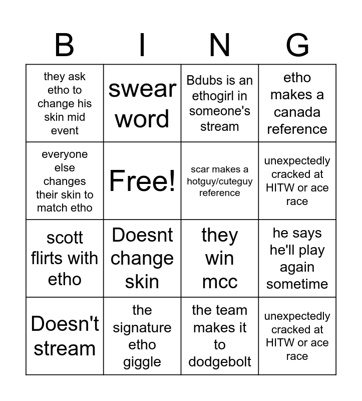 This bingo card has 51 words: Doesnt change skin, Doesn't stream, Tubbo talks to him in chat, Bdubs is an ethogirl in someone's stream, Etho kills at LEAST three players in sky battle, Places in the top 20, swear word, the team dominates in grid runners or build mart, Free!, "oh snappers!", scar makes a hotguy/cuteguy reference, etho makes a canada reference, he says something insane about his personal life like it's completely normal, free space (everyone in the event is an ethogirl), kills someone with a bow, the team makes it to dodgeboly, unexpectedly cracked at HITW or ace race, the signature etho giggle, he talks about bdubs, everyone else changes their skin to match etho, he says he'll play again sometime, they win mcc, they ask etho to change his skin mid event, scott flirts with etho, etho and joel kill each other, sand daddy etho, Doesnt change skin, Doesn't stream, Tubbo talks to him in chat, Bdubs is an ethogirl in someone's stream, Etho kills at LEAST three players in sky battle, Places in the top 20, swear word, the team dominates in grid runners or build mart, "oh snappers!", scar makes a hotguy/cuteguy reference, etho makes a canada reference, he says something insane about his personal life like it's completely normal, everyone in the event is an ethogirl, kills someone with a bow, the team makes it to dodgebolt, unexpectedly cracked at HITW or ace race, the signature etho giggle, he talks about bdubs, everyone else changes their skin to match etho, he says he'll play again sometime, they win mcc, they ask etho to change his skin mid event, scott flirts with etho, etho and joel kill each other and sand daddy etho.