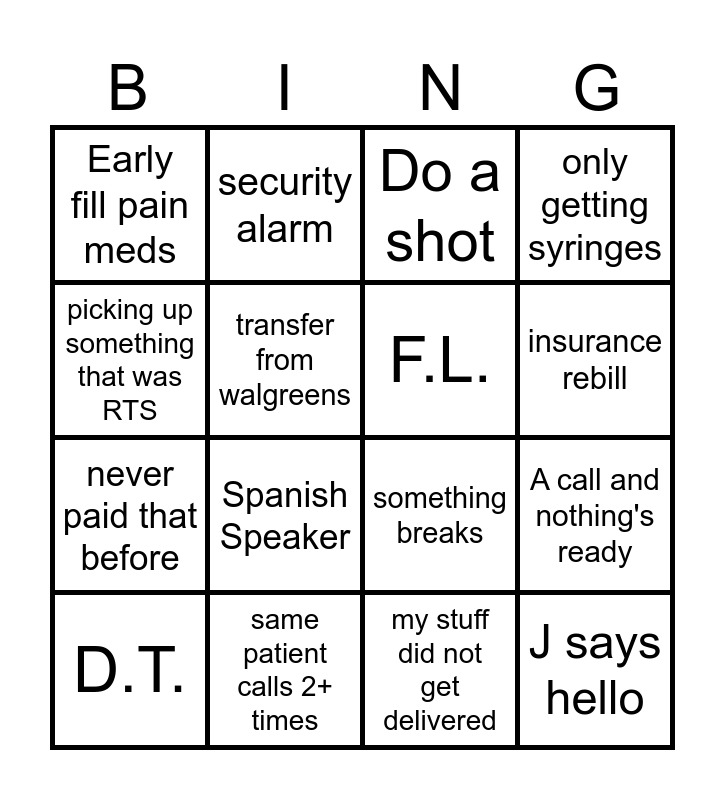 This bingo card has 16 words: same patient calls 2+ times, A call and nothing's ready, Do a shot, Early fill pain meds, never paid that before, security alarm, something breaks, my stuff did not get delivered, picking up something that was RTS, transfer from walgreens, D.T., only getting syringes, Spanish Speaker, insurance rebill, F.L. and J says hello.