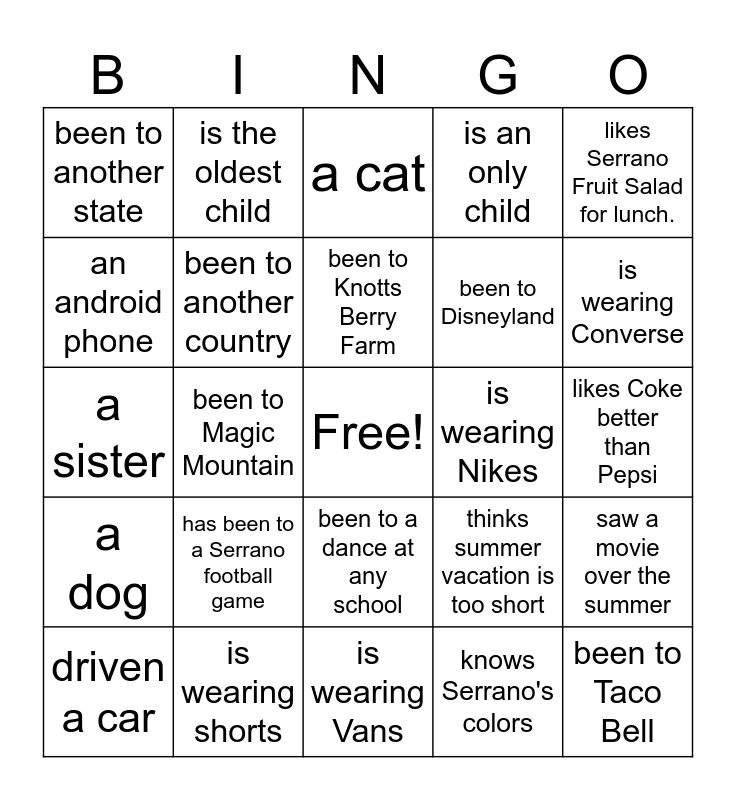 This bingo card has a free space and 29 words: driven a car, been to the beach, been to Magic Mountain, likes Takis better than Hot Cheetos, been to another state, a cat, been to another country, has been to a Serrano football game, is wearing Nikes, is wearing shorts, likes Coke better than Pepsi, been to Taco Bell, is wearing Vans, knows Serrano's colors, is wearing Converse, a brother, been to a dance at any school, a dog, likes Serrano Fruit Salad for lunch., a sister, thinks summer vacation is too short, likes Serrano Tacos for lunch, been to Disneyland, an android phone, is an only child, is the oldest child, saw a movie over the summer, been to Knotts Berry Farm and bought new clothes for school.
