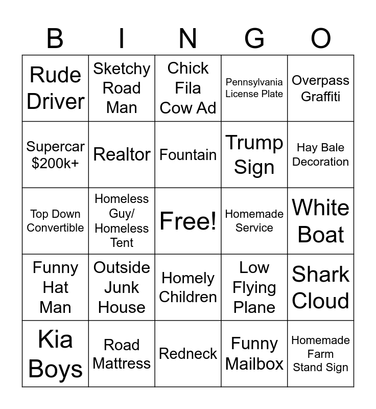 This bingo card has a free space and 56 words: Sketchy Nogs, Kia Boys, Roadside Broken Down Car, Rude Driver, Redneck, Unexpected Driver, Realtor, Braves Sign, Trump Sign, Biden Sign, Pennsylvania License Plate, California License Plate, Big Road Debris, Baby On Board, Student Driver Sticker, Arm Hanging Out Window, Overpass Graffiti, Homeless Guy/ Homeless Tent, Abandoned Sticker Car, Homemade Farm Stand Sign, Homemade Service, Diversity Billboard, Low Flying Plane, Chick Fila Cow Ad, Roadkill, Fountain, Christmas Decor, Halloween Decor, Hay Bale Decoration, Sexual Innuendo, Wash Me Dirty Car, Biker Lady, Jackwagon, Loaded Family Vacation, White Boat, Supercar $200k+, Top Down Convertible, Big Hat Lady, Funny Hat Man, Sketchy Road Man, Homely Children, Ugly Green House, Cute Orange House, Dinosaur, Nautical Ropes, Outside Junk House, Road Mattress, Dog, Cat, First Palm Tree, Funny Mailbox, Kayak, Tractor, Turtle Cloud, Shark Cloud and Seahorse Cloud.