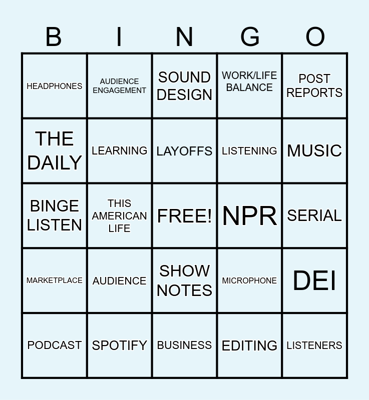 This bingo card has a free space and 29 words: PODCAST, SCIENCE, THIS AMERICAN LIFE, APPLE PODCASTS, HEADPHONES, SOUND DESIGN, LEARNING, AUDIENCE, NPR, SPOTIFY, SERIAL, LISTENERS, BUSINESS, EDITING, MUSIC, STITCHER, SHOW NOTES, MARKETPLACE, POST REPORTS, BINGE LISTEN, MICROPHONE, STORYTELLING, LISTENING, THE DAILY, WORK/LIFE BALANCE, AUDIENCE ENGAGEMENT, DEI, LAYOFFS and PODCAST BUBBLE.