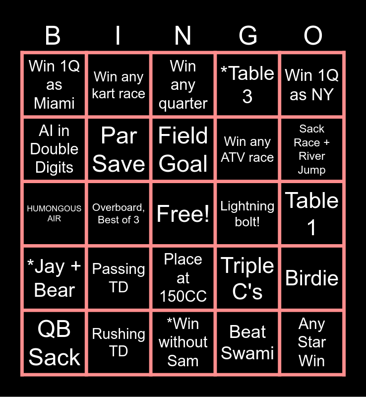 This bingo card has a free space and 24 words: Passing TD, Rushing TD, Field Goal, QB Sack, Win 1Q as NY, Win 1Q as Miami, AI in Double Digits, Win any kart race, Lightning bolt!, Place at 150CC, Win any ATV race, HUMONGOUS AIR, Triple C's, Birdie, Par Save, Beat Swami, Table 1, Win any quarter, Sack Race + River Jump, Overboard, Best of 3, Any Star Win, *Jay + Bear, *Table 3 and *Win without Sam.