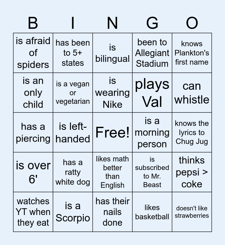 This bingo card has a free space and 24 words: has a ratty white dog, is a Scorpio, is wearing Nike, watches YT when they eat, knows Plankton's first name, is afraid of spiders, is an only child, has been to 5+ states, is a morning person, likes math better than English, plays Val, has a piercing, is subscribed to Mr. Beast, thinks pepsi > coke, is a vegan or vegetarian, likes basketball, knows the lyrics to Chug Jug, is bilingual, can whistle, is left-handed, doesn't like strawberries, is over 6', been to Allegiant Stadium and has their nails done.