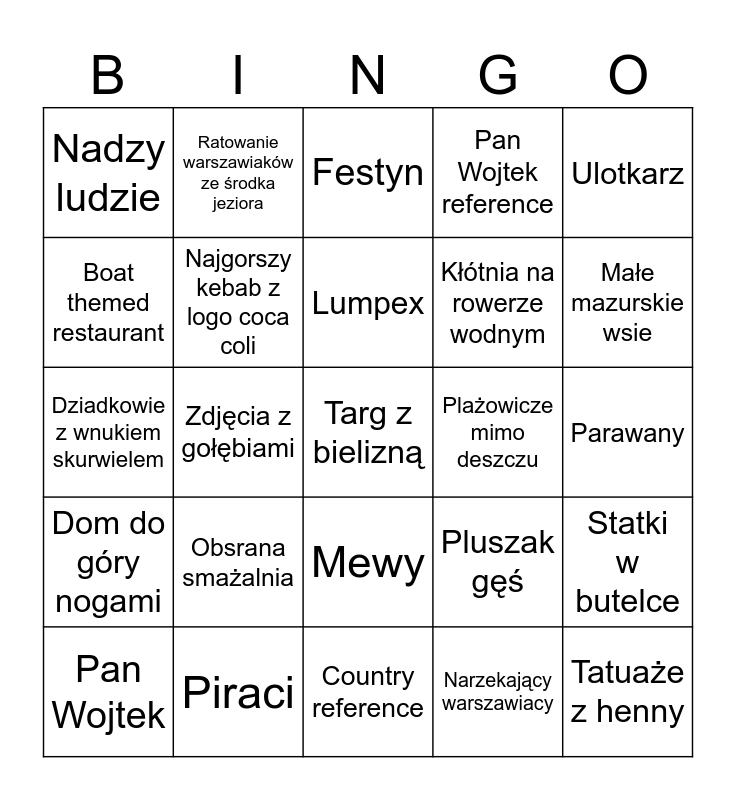 This bingo card has a free space and 24 words: Pan Wojtek, Obsrana smażalnia, Lumpex, Narzekający warszawiacy, Ulotkarz, Nadzy ludzie, Ratowanie warszawiaków ze środka jeziora, Festyn, Plażowicze mimo deszczu, Parawany, Dziadkowie z wnukiem skurwielem, Najgorszy kebab z logo coca coli, Pluszak gęś, Statki w butelce, Boat themed restaurant, Piraci, Country reference, Pan Wojtek reference, Małe mazurskie wsie, Dom do góry nogami, Zdjęcia z gołębiami, Mewy, Kłótnia na rowerze wodnym and Tatuaże z henny.