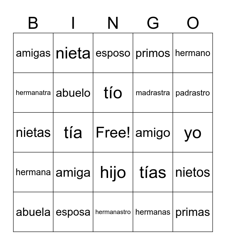 This bingo card has a free space and 39 words: madre, padre, hija, abuelo, abuela, hijo, tío, familia, hermano, hermana, tía, primos, primas, yo, amigo, amiga, amigos, amigas, tíos, tías, hermanatra, hermanastro, madrastra, padrastro, hijo, hija, hijos, hijas, nieto, nieta, sobrino, sobrina, esposo, esposa, hermanas, hermanos, nietos, nietas and abuelos.