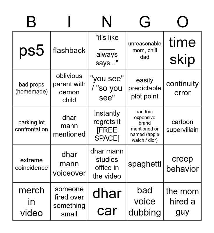 This bingo card has a free space and 25 words: dhar mann voiceover, dhar car, "you see" / "so you see", merch in video, time skip, ps5, bad props (homemade), flashback, random expensive brand mentioned or named (apple watch / dior), dhar mann studios office in the video, easily predictable plot point, parking lot confrontation, spaghetti, creep behavior, oblivious parent with demon child, kids with ipad, cartoon supervillain, "it's like ____ always says...", continuity error, dhar mann mentioned, the mom hired a guy, someone fired over something small, extreme coincidence, unreasonable mom, chill dad and bad voice dubbing.