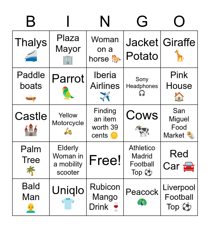 This bingo card has 26 words: Free!, Peacock ðĶ, Iberia Airlines âïļ, Uniqlo ð, Giraffe ðĶ, Thalys ð, Paddle boats ðķ, Plaza Mayor ðĒ, San Miguel Food Market ðŊ, Athletico Madrid Football Top â―ïļ, Sony Headphones ð§, Castle ð°, Red Car ð, Bald Man ðĻâðĶē, Yellow Motorcycle ðĩ, Blue haired emo lady, Jacket Potato, Palm Tree ðī, Woman on a horse ð, Finding an item worth 39 cents ðŠ, Pink House ð , Rubicon Mango Drink ð·, Cows ð, Elderly Woman in a mobility scooter, Parrot ðĶ and Liverpool Football Top â―ïļ.