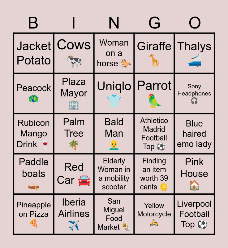 This bingo card has 27 words: Pineapple on Pizza ð, Boeing 747 âïļ, Peacock ðĶ, Iberia Airlines âïļ, Uniqlo ð, Giraffe ðĶ, Thalys ð, Paddle boats ðķ, Plaza Mayor ðĒ, San Miguel Food Market ðŊ, Athletico Madrid Football Top â―ïļ, Sony Headphones ð§, Castle ð°, Red Car ð, Bald Man ðĻâðĶē, Yellow Motorcycle ðĩ, Blue haired emo lady, Jacket Potato, Palm Tree ðī, Woman on a horse ð, Finding an item worth 39 cents ðŠ, Pink House ð , Rubicon Mango Drink ð·, Cows ð, Elderly Woman in a mobility scooter, Parrot ðĶ and Liverpool Football Top â―ïļ.