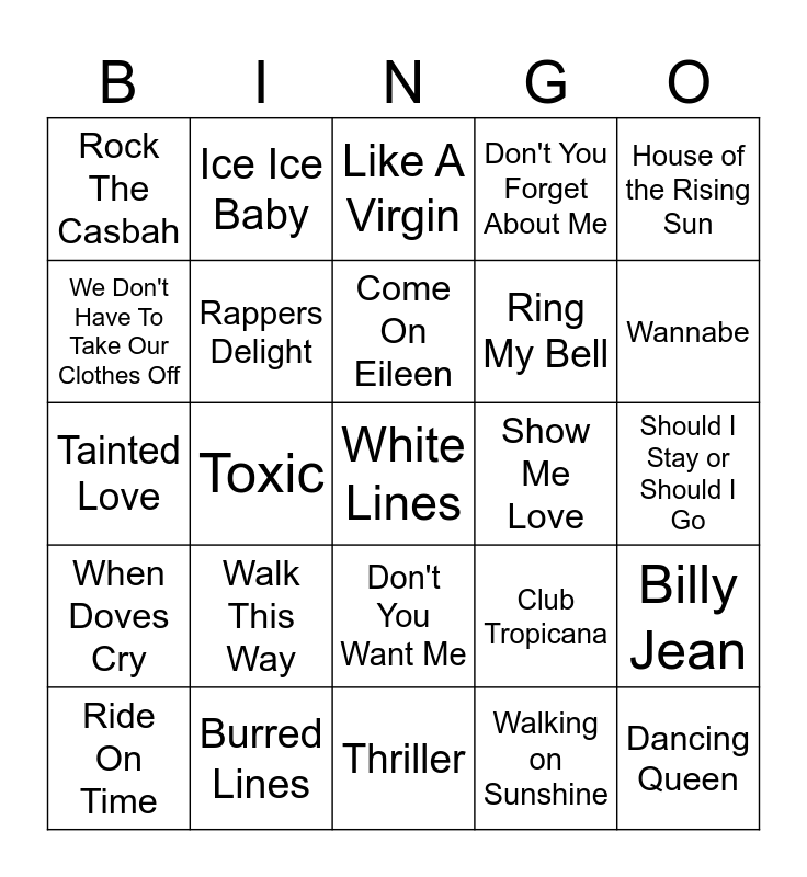 This bingo card has 53 words: Rhythm Is A Dancer, White Lines, Word Up, Walking on Sunshine, Walk This Way, Final Countdown, Ice Ice Baby, Just Be Good To Me, We Don't Have To Take Our Clothes Off, The Power, Rappers Delight, Relight My Fire, Billy Jean, Club Tropicana, Staying Alive, Ride On Time, Come On Eileen, Show Me Love, Bitter Sweet Symphony, House of the Rising Sun, Toxic, Dancing Queen, Ring My Bell, Rock The Casbah, Young Hearts Run Free, Burred Lines, Lets Groove, Don't Go, We Will Rock You, Wannabe, Fame, The Best, You're The One For Me, Somebody Else's Guy, It's Raining Men, Livin On A Prayer, Don't You Forget About Me, Thriller, Like A Virgin, Take On Me, Never Gonna Give You Up, Karma Chameleon, Should I Stay or Should I Go, Sweet Dreams, Everybody Wants To Rule The World, Don't You Want Me, You Spin Me Round, Running Up That Hill, Tainted Love, When Doves Cry, Sweet Caroline, Pretty Woman and The Only Way Is Up.
