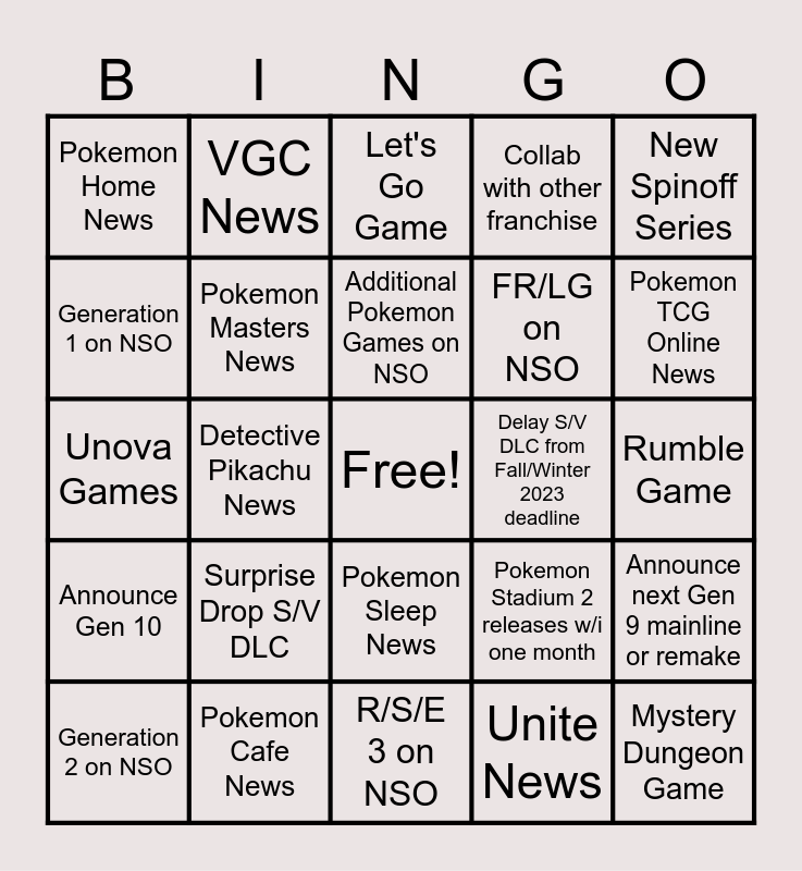 This bingo card has a free space and 24 words: Surprise Drop S/V DLC, Pokemon Cafe News, Additional Pokemon Games on NSO, Generation 2 on NSO, New Spinoff Series, Pokemon Home News, Generation 1 on NSO, VGC News, Delay S/V DLC from Fall/Winter 2023 deadline, Pokemon Sleep News, FR/LG on NSO, Unova Games, Pokemon Stadium 2 releases w/i one month, Announce next Gen 9 mainline or remake, Pokemon Masters News, Unite News, Rumble Game, Let's Go Game, Pokemon TCG Online News, Detective Pikachu News, Mystery Dungeon Game, Announce Gen 10, Collab with other franchise and R/S/E 3 on NSO.