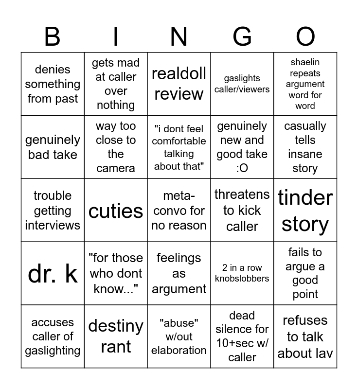 This bingo card has a free space and 24 words: "for those who dont know...", destiny rant, "i dont feel comfortable talking about that", accuses caller of gaslighting, shaelin repeats argument word for word, denies something from past, genuinely bad take, gets mad at caller over nothing, threatens to kick caller, feelings as argument, genuinely new and good take :O, trouble getting interviews, 2 in a row knobslobbers, fails to argue a good point, way too close to the camera, dead silence for 10+sec w/ caller, tinder story, realdoll review, casually tells insane story, cuties, refuses to talk about lav, dr. k, gaslights caller/viewers and "abuse" w/out elaboration.