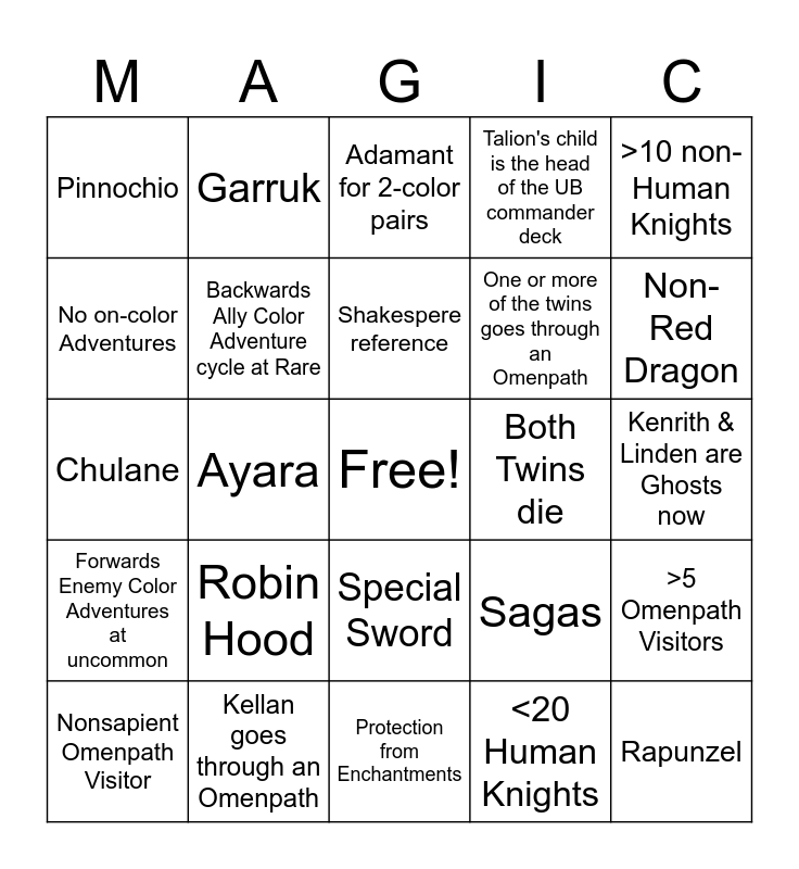 This bingo card has a free space and 59 words: ONLY 1 of the Twins dies, Kellan goes through an Omenpath, The Three Witches are killed, Forwards Enemy Color Adventures at uncommon, <20 Human Knights, There's another extraplanar legend (aside from Troyan), Backwards Ally Color Adventure cycle at Rare, Ashiok dies, One or more of the twins goes through an Omenpath, The Wicked Slumber ends, Talion's child is the head of the UB commander deck, Little Jack Horner, No on-color Adventures, Adventures on Artifacts, Cinderella, Pinnochio, Rapunzel, >10 non-Human Knights, Merlin, Shakespere reference, Both Twins die, Adamant for 2-color pairs, Nonsapient Omenpath Visitor, >5 Omenpath Visitors, Jiminy Cricket, Emry, Torbran, Rankle, Non-Red Dragon, Objects come through the omenpaths, Omenpath directly to a hazard, Aura that makes its target a Food, Beauty and/or Beast, Grumgully, Garruk, Oko, Hengestones are of story importance, Ayara, Cycle of color hate cards, Chulane, One or more of the Legendary Artifacts from ELD is broken, Robin Hood, Kenrith & Linden are Ghosts now, Rare cycle of Legendary Enchantments, Two cycles of 2-color legends (one at rare and one at uncommon), Human typal, Questing Beast, Enchantments with Adventures, Special Sword, Protection from Enchantments, +1/+1 counter archetype, Creature Tokens archetype, Constellation, Enchantment Creatures, Bestow, Sagas, Niko Aris, Enchantment tokens and There is a Phyrexian creature.