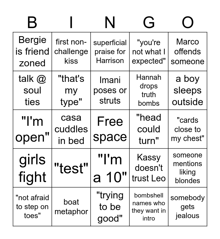 This bingo card has a free space and 24 words: "test", boat metaphor, Imani poses or struts, "not afraid to step on toes", Marco offends someone, Bergie is friend zoned, talk @ soul ties, first non-challenge kiss, "head could turn", "I'm a 10", Hannah drops truth bombs, "I'm open", Kassy doesn't trust Leo, someone mentions liking blondes, "that's my type", bombshell names who they want in intro, "cards close to my chest", superficial praise for Harrison, a boy sleeps outside, casa cuddles in bed, somebody gets jealous, girls fight, "you're not what I expected" and "trying to be good".
