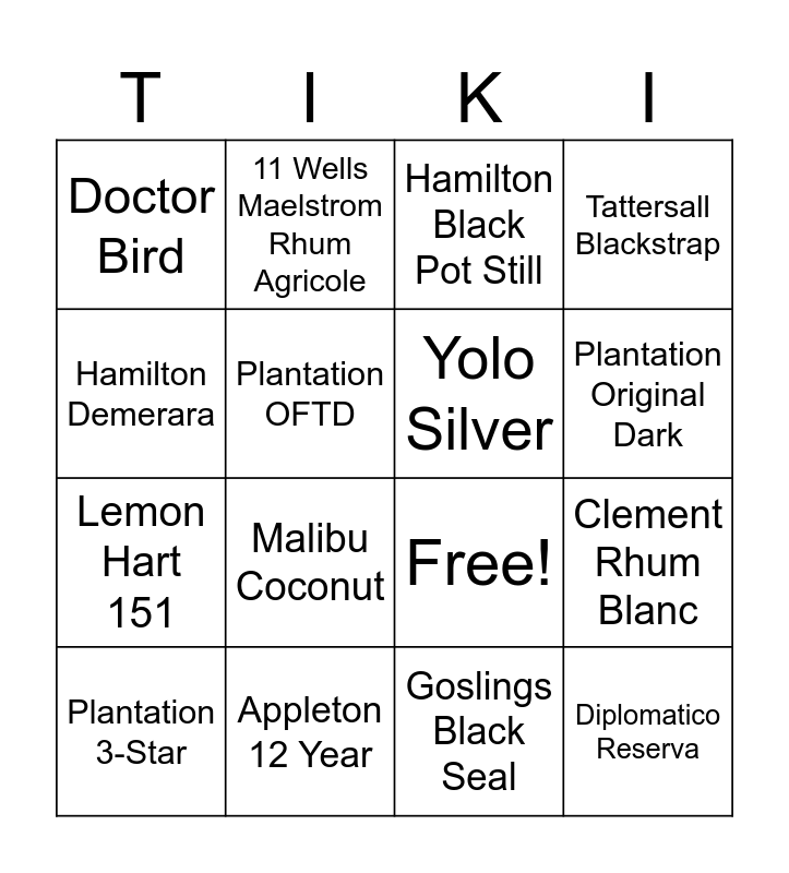 This bingo card has 21 words: Appleton 12 Year, Wray & Nephew White, 11 Wells Maelstrom Rhum Agricole, Havana Club Silver, Goslings Black Seal, Yolo Silver, Doctor Bird, Hamilton Black Pot Still, Free!, Plantation Original Dark, Lemon Hart 151, Tattersall Blackstrap, Diplomatico Reserva, Tiki Lovers White, Plantation OFTD, Smith & Cross Jamaican, Plantation 3-Star, Malibu Coconut, Hamilton Demerara, Clement Rhum Blanc and Real McCoy 5-year.