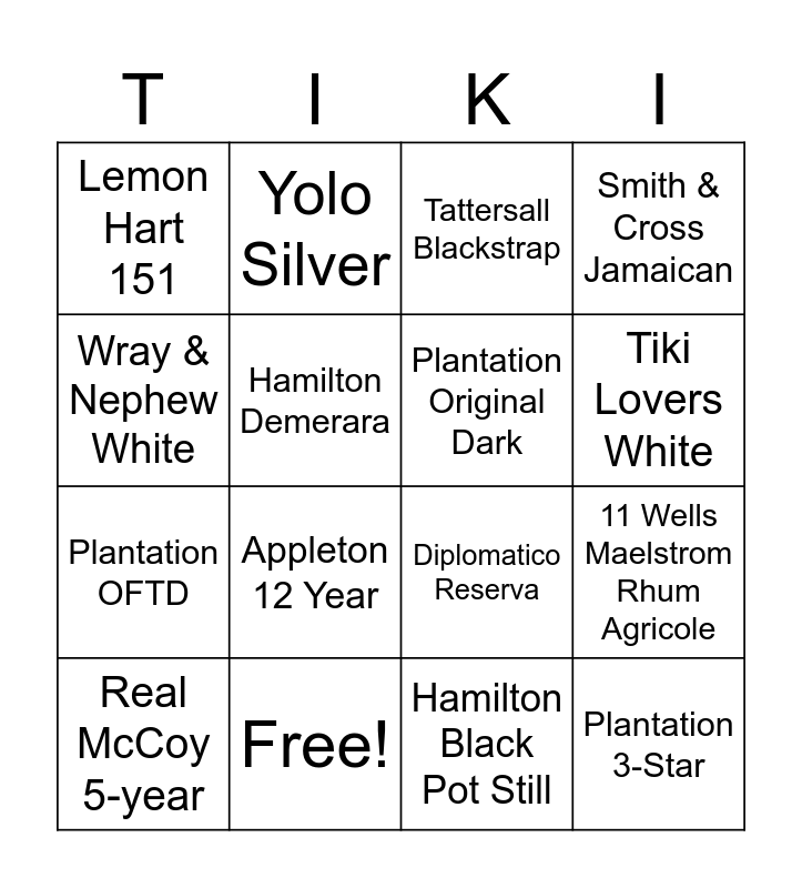 This bingo card has 21 words: Free!, Goslings Black Seal, Yolo Silver, Doctor Bird, Hamilton Black Pot Still, Plantation Original Dark, Lemon Hart 151, Tattersall Blackstrap, Diplomatico Reserva, Tiki Lovers White, Plantation OFTD, Smith & Cross Jamaican, Plantation 3-Star, Malibu Coconut, Hamilton Demerara, Clement Rhum Blanc, Real McCoy 5-year, Appleton 12 Year, Wray & Nephew White, 11 Wells Maelstrom Rhum Agricole and Havana Club Silver.