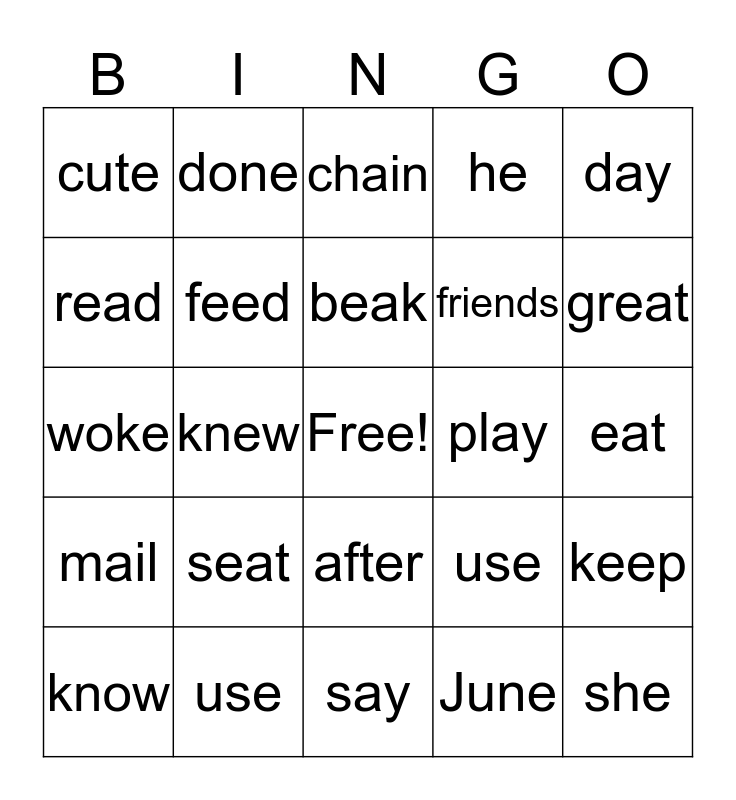 This bingo card has a free space and 38 words: me, day, we, feed, keep, seat, beak, main, day, friends, knew, he, she, eat, read, mail, rain, chain, way, play, cute, use, great, know, always, say, tell, may, mule, nose, flute, after, June, done, tune, use, woke and cute.