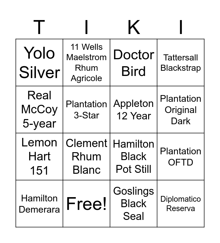 This bingo card has 21 words: Free!, Wray & Nephew White, 11 Wells Maelstrom Rhum Agricole, Havana Club Silver, Goslings Black Seal, Appleton 12 Year, Yolo Silver, Doctor Bird, Hamilton Black Pot Still, Plantation Original Dark, Lemon Hart 151, Tattersall Blackstrap, Diplomatico Reserva, Tiki Lovers White, Plantation 3-Star, Malibu Coconut, Hamilton Demerara, Clement Rhum Blanc, Real McCoy 5-year, Plantation OFTD and Smith & Cross Jamaican.