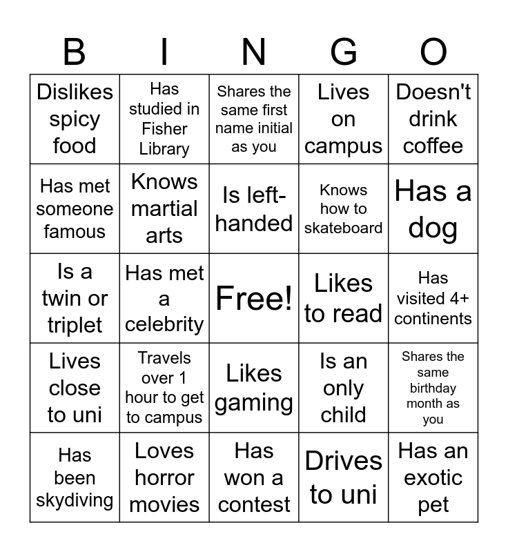 This bingo card has a free space and 67 words: Wakes up early, Stays up late, Goes to sleep before 12, Shares the same birthday month as you, Has broken a bone, Plays a musical instrument, Has studied in Fisher Library, Has studied in Sci-tech Library, Is left-handed, Is double-jointed, Likes gaming, Has travelled in the last 6 months, Has visited 4+ continents, Doesn't drink coffee, Regularly drinks tea, Has met someone famous, Has met a celebrity, Dislikes spicy food, Knows how to surf, Knows how to skateboard, Travels over 1 hour to get to campus, Lives close to uni, Lives on campus, Drives to uni, Likes true crime podcasts, Attended a concert this year, Is in more than 2 uni societies, Can do a cartwheel, Has a dog, Has a cat, Has an exotic pet, Likes pineapple on pizza, Drives to uni, Wears contacts, Wears glasses, Has been skydiving, Has done an extreme sport, Is an only child, Is a twin or triplet, Has siblings, Can speak 3+ languages, Knows martial arts, Likes to read, Can code, Can bake, Has been scuba-diving, Has been snowboarding, Loves horror movies, Has an unusual hobby, Has a sweet tooth, Shares the same first name initial as you, Has been on a road trip, Has been on a cruise, Loves roller coasters, Has ran in a marathon, Has won a contest, Read 10+ books this year, Has taken dance lessons, Grew up in this city, Loves karaoke, Can ride a bicycle, Is vegetarian, Has won a contest, Built an app, Has food allergies, Prefers working in the morning and Prefers working at night.