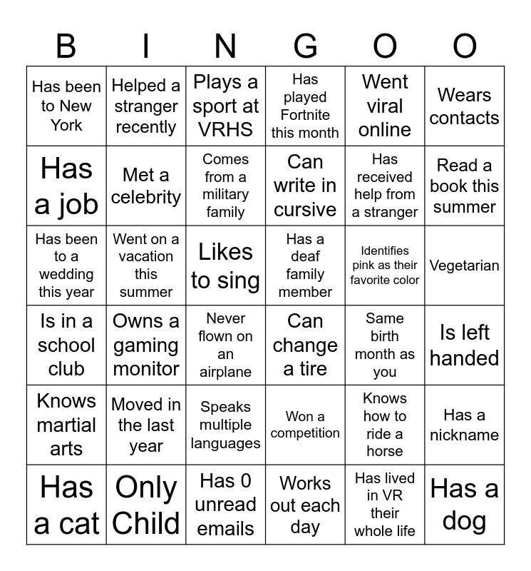 This bingo card has 36 words: Won a competition, Speaks multiple languages, Works out each day, Has a job, Is in a school club, Has a deaf family member, Met a celebrity, Has 0 unread emails, Went viral online, Knows how to ride a horse, Read a book this summer, Has played Fortnite this month, Has a nickname, Went on a vacation this summer, Can write in cursive, Has been to New York, Knows martial arts, Identifies pink as their favorite color, Has been to a wedding this year, Plays a sport at VRHS, Likes to sing, Owns a gaming monitor, Can change a tire, Never flown on an airplane, Same birth month as you, Helped a stranger recently, Has received help from a stranger, Only Child, Comes from a military family, Wears contacts, Has a dog, Has a cat, Is left handed, Vegetarian, Moved in the last year and Has lived in VR their whole life.