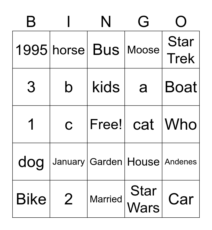 This bingo card has a free space and 24 words: January, 2, kids, Bike, Star Trek, 1995, 3, horse, cat, Garden, a, 1, House, Andenes, b, Star Wars, Who, Bus, Boat, c, Car, dog, Moose and Married.