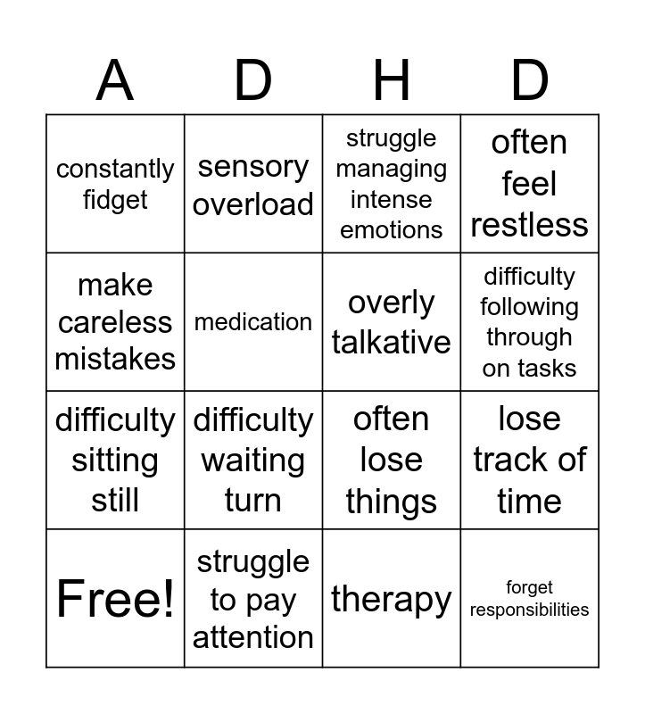 This bingo card has 16 words: struggle to pay attention, lose track of time, struggle managing intense emotions, constantly fidget, difficulty sitting still, sensory overload, often lose things, therapy, make careless mistakes, medication, Free!, often feel restless, difficulty waiting turn, difficulty following through on tasks, overly talkative and forget responsibilities.