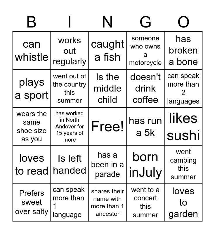 This bingo card has a free space and 24 words: Is left handed, can speak more than 1 language, Is the middle child, Prefers sweet over salty, has broken a bone, can whistle, plays a sport, works out regularly, has run a 5k, has a been in a parade, doesn't drink coffee, wears the same shoe size as you, born inJuly, went camping this summer, went out of the country this summer, went to a concert this summer, likes sushi, caught a fish, can speak more than 2 languages, has worked in North Andover for 15 years of more, loves to garden, loves to read, someone who owns a motorcycle and shares their name with more than 1 ancestor.