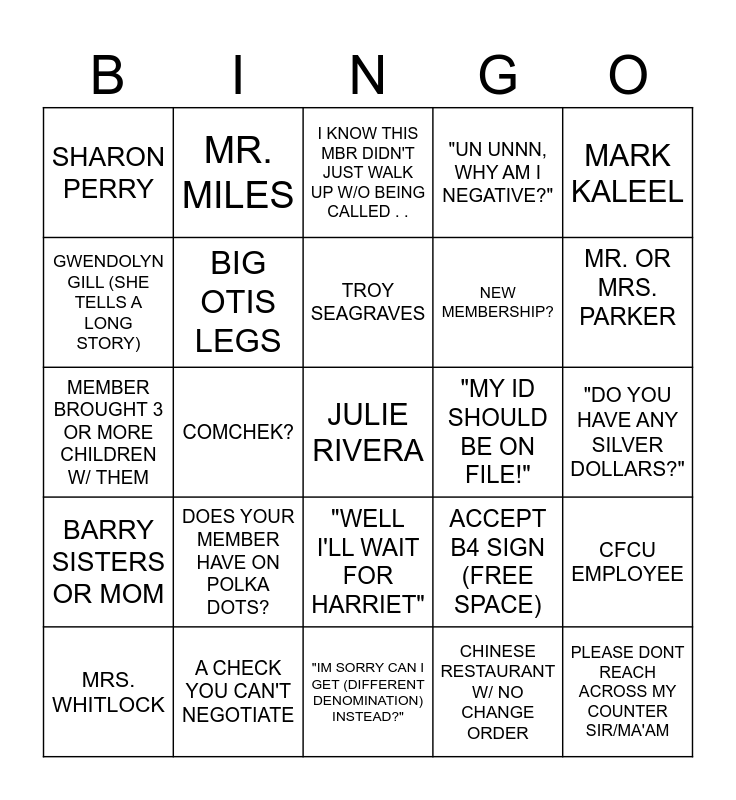 This bingo card has 25 words: DOES YOUR MEMBER HAVE ON POLKA DOTS?, "IM SORRY CAN I GET (DIFFERENT DENOMINATION) INSTEAD?", TROY SEAGRAVES, MRS. WHITLOCK, MARK KALEEL, SHARON PERRY, GWENDOLYN GILL (SHE TELLS A LONG STORY), MR. MILES, "MY ID SHOULD BE ON FILE!", "WELL I'LL WAIT FOR HARRIET", NEW MEMBERSHIP?, MEMBER BROUGHT 3 OR MORE CHILDREN W/ THEM, ACCEPT B4 SIGN (FREE SPACE), CFCU EMPLOYEE, BIG OTIS LEGS, PLEASE DONT REACH ACROSS MY COUNTER SIR/MA'AM, "DO YOU HAVE ANY SILVER DOLLARS?", I KNOW THIS MBR DIDN'T JUST WALK UP W/O BEING CALLED . ., MR. OR MRS. PARKER, COMCHEK?, JULIE RIVERA, A CHECK YOU CAN'T NEGOTIATE, BARRY SISTERS OR MOM, "UN UNNN, WHY AM I NEGATIVE?" and CHINESE RESTAURANT W/ NO CHANGE ORDER.