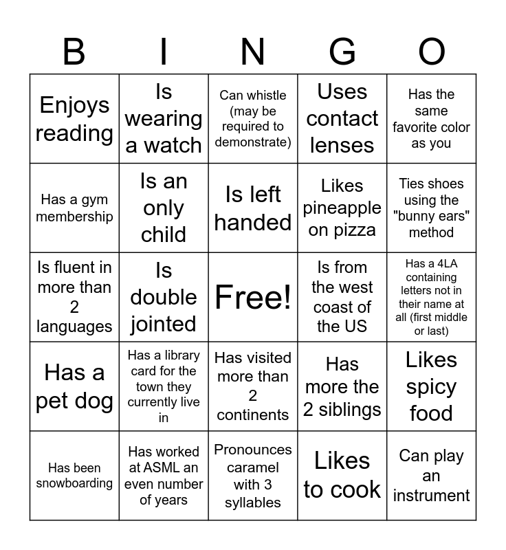 This bingo card has 1 images, a free space and 35 words: Has blue eyes, Born in the same month as you, Is an only child, Has more the 2 siblings, Has a pet dog, Is left handed, Has broken a bone before, Has the same favorite color as you, Can juggle (may be required to demonstrate), Is double jointed, Uses contact lenses, Was born in Connecticut, Is from the west coast of the US, Ties shoes using the "bunny ears" method, Enjoys reading, Has physical money with them, Has a library card for the town they currently live in, Can play an instrument, Can whistle (may be required to demonstrate), Has a 4LA containing letters not in their name at all (first middle or last), Likes spicy food, Has worked at ASML an even number of years, Has been snowboarding, Pronounces caramel with 3 syllables, Is wearing a watch, Is fluent in more than 2 languages, Has met a celebrity, Likes pineapple on pizza, Has a gym membership, Can recite the first 15 digits of Pi by memory, is an iPhone user, Likes to cook, Has visited more than 2 continents, Has gone to concert in the last 6 months and Doesn't like coffee.