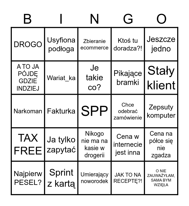 This bingo card has a free space and 24 words: Najpierw PESEL?, Ja tylko zapytać, Je takie co?, JAK TO NA RECEPTĘ?!, Jeszcze jedno, DROGO, Usyfiona podłoga, Zbieranie ecommerce, Chce odebrać zamówienie, Zepsuty komputer, Narkoman, Wariat_ka, Cena w internecie jest inna, Cena na półce się nie zgadza, A TO JA PÓJDĘ GDZIE INDZIEJ, Sprint z kartą, Umierający noworodek, Ktoś tu doradza?!, Stały klient, TAX FREE, Fakturka, Nikogo nie ma na kasie w drogerii, Pikające bramki and O NIE ZAUWAŻYŁAM, SAMA BYM WZIĘŁA.