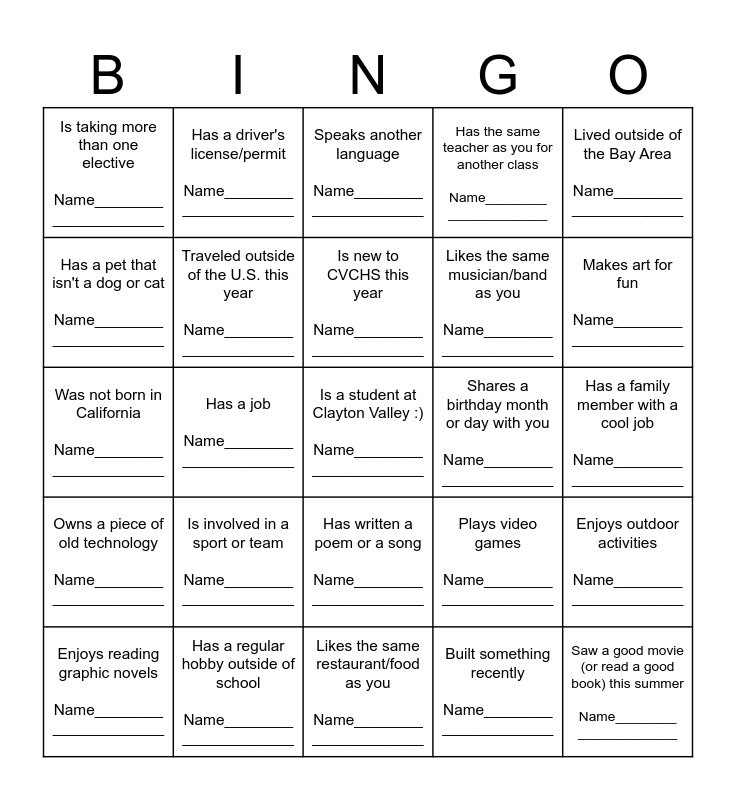 This bingo card has a free space and 24 words: Is involved in a sport or team Name________ _____________, Has a regular hobby outside of school Name________ _____________, Is new to CVCHS this year Name________ _____________, Enjoys reading graphic novels Name________ _____________, Lived outside of the Bay Area Name________ _____________, Is taking more than one elective Name________ _____________, Has a pet that isn't a dog or cat Name________ _____________, Has a driver's license/permit Name________ _____________, Shares a birthday month or day with you Name________ _____________, Has written a poem or a song Name________ _____________, Likes the same musician/band as you Name________ _____________, Was not born in California Name________ _____________, Plays video games Name________ _____________, Enjoys outdoor activities Name________ _____________, Traveled outside of the U.S. this year Name________ _____________, Built something recently Name________ _____________, Has a family member with a cool job Name________ _____________, Speaks another language Name________ _____________, Makes art for fun Name________ _____________, Has a job Name________ _____________, Saw a good movie (or read a good book) this summer Name________ _____________, Owns a piece of old technology Name________ _____________, Has the same teacher as you for another class Name________ _____________ and Likes the same restaurant/food as you Name________ _____________.