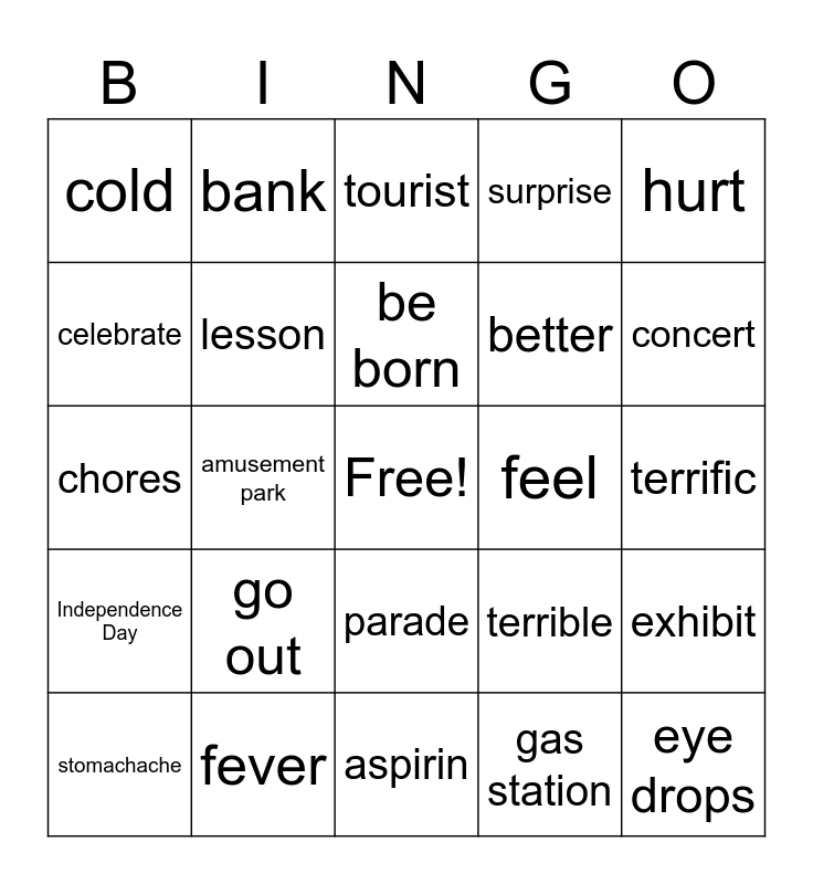 This bingo card has a free space and 54 words: birthday, Independence Day, wedding, birthday cake, parade, present, surprise, traditional, celebrate, decorate, cold, earache, fever, stomachache, antacid, aspirin, eye drops, better, fantastic, terrific, terrible, awful, feel, hurt, avenue, bank, bookstore, department store, drugstore, gas station, street, attraction, debit card, statue, tourist, barbecue, chores, exhibit, instructor, lesson, shopping, vacation, do laungry, go camping, go out, hang out, graduate, grow up, be born, amusement park, concert, street fair, festival and invitation.