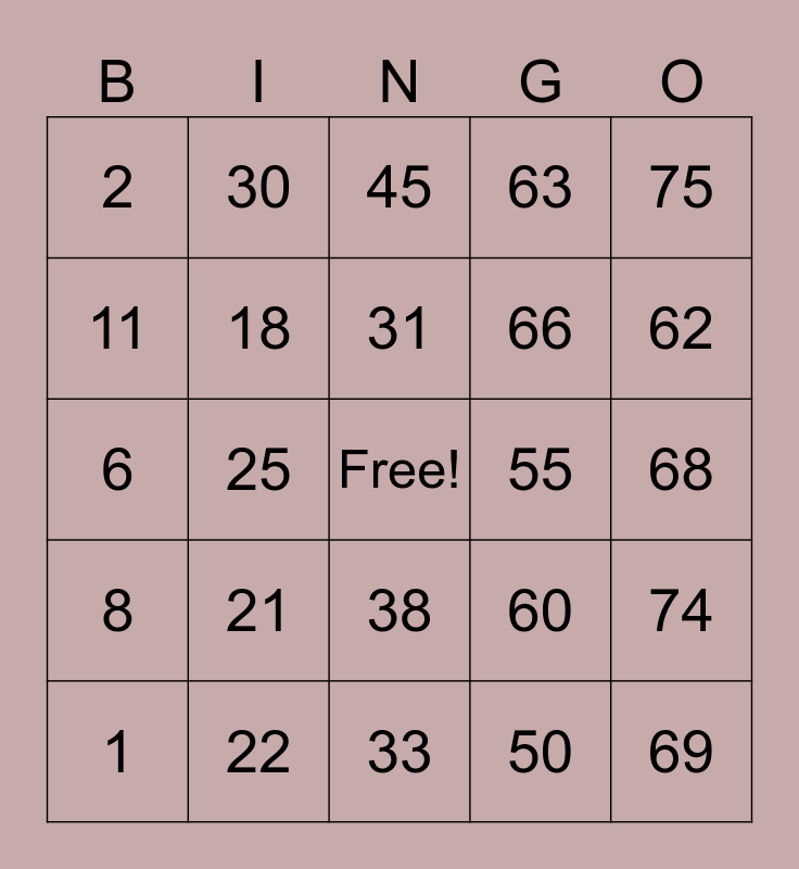 This bingo card has a free space and 24 words: 1, 21, 31, 50, 75, 2, 30, 45, 55, 68, 6, 18, 60, 74, 11, 22, 33, 63, 62, 8, 25, 38, 66 and 69.