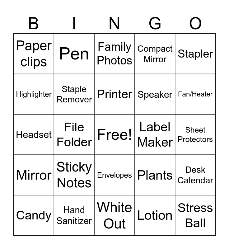This bingo card has a free space and 24 words: Sticky Notes, Hand Sanitizer, Printer, Candy, Stapler, Paper clips, Highlighter, Pen, Label Maker, Envelopes, Speaker, Headset, Plants, Desk Calendar, Staple Remover, Lotion, Sheet Protectors, Family Photos, Fan/Heater, File Folder, Stress Ball, Mirror, Compact Mirror and White Out.