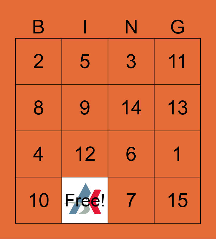 This bingo card has 1 images and 16 words: Free!, 1, 3, 2, 4, 5, 6, 7, 8, 9, 10, 11, 12, 13, 14 and 15.