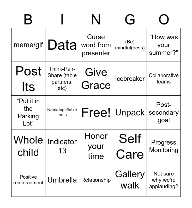 This bingo card has a free space and 47 words: Golden Thread, Not sure why we're applauding?, Your Why, Relationship, Indicator 13, Kiddos, Data, Butcher Paper, Post Its, "Get Creative", Think-Pair-Share (table partners, etc), (Be) mindful(ness), Progress Monitoring, Self Care, Handout or slide read aloud word-for-word, Rigor, Give Grace, Unpack, Brain Break, "How was your summer?", Nametags/table tents, Gallery walk, meme/gif, Icebreaker, Excellence, Collaborative teams, Positive reinforcement, Incentivize, Honor your time, Whole child, Comic Sans font, My.cherrycreek tile, Schoology, Fidelity, Your truth, Umbrella, Post-secondary goal, List of Resources, Cartoon clip art, COVID/Pandemic, Curse word from colleague, Curse word from presenter, “Put it in the Parking Lot”, Around the world share, Awkward introductions, Questions I don’t want the answers to and This could have been an email.
