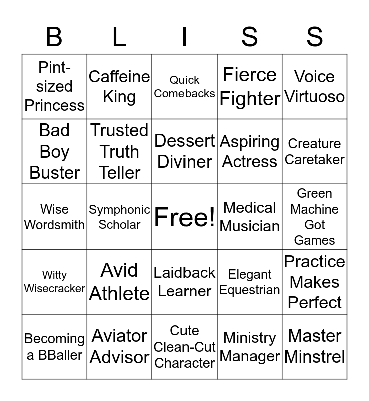 This bingo card has a free space and 24 words: Avid Athlete, Aviator Advisor, Dessert Diviner, Becoming a BBaller, Voice Virtuoso, Pint-sized Princess, Bad Boy Buster, Caffeine King, Medical Musician, Laidback Learner, Aspiring Actress, Wise Wordsmith, Elegant Equestrian, Practice Makes Perfect, Trusted Truth Teller, Ministry Manager, Green Machine Got Games, Quick Comebacks, Creature Caretaker, Symphonic Scholar, Master Minstrel, Witty Wisecracker, Fierce Fighter and Cute Clean-Cut Character.