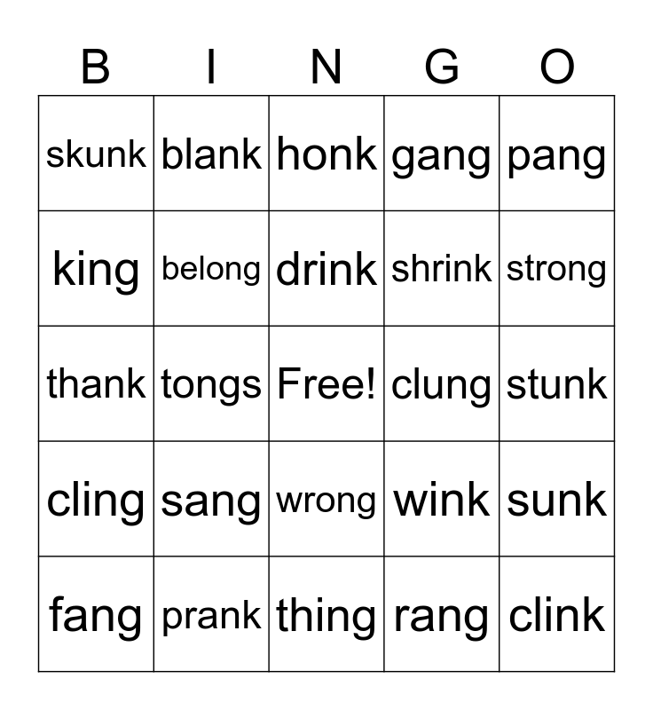 This bingo card has a free space and 29 words: fang, fling, tongs, sink, skunk, honk, belong, sang, clung, prank, stunk, clink, thing, rang, strong, trunk, wrong, cling, pang, thank, wink, chunk, shrink, king, gang, blank, sunk, drink and ring.