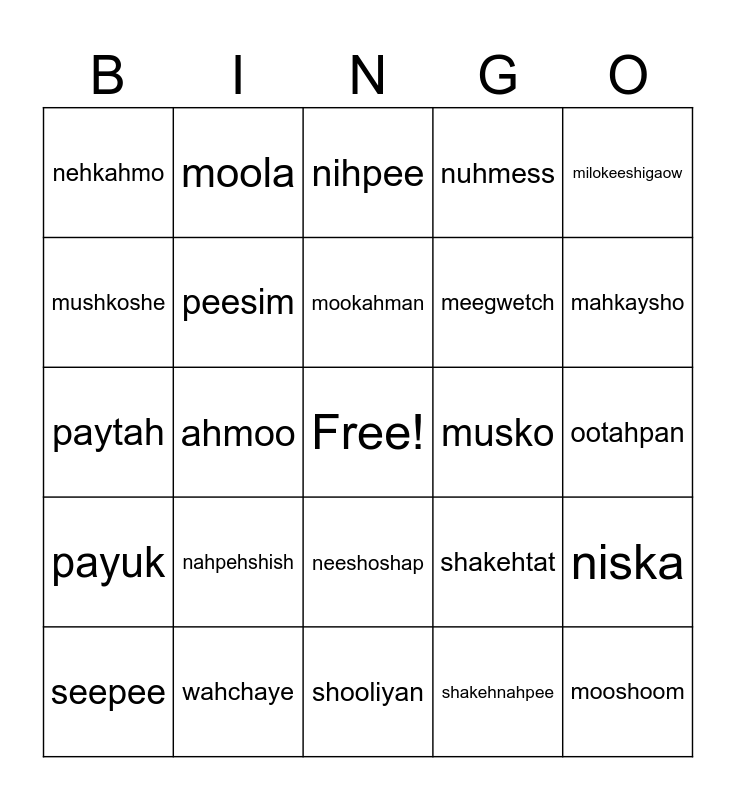 This bingo card has a free space and 34 words: mehmempsoon, shakehnahpee, dahkoonah, cheecheesh, payuk, peesim, milokeeshigaow, seepee, moola, meechim, mookahman, nihpee, kihmihowan, wahbush, musko, mahkaysho, wahchaye, paytah, nahpehshish, shakehtat, neeshoshap, mahchah, nehkahmo, ootahpan, shooliyan, mooshoom, nuhmess, shikahk, meegwetch, mushkoshe, cheeman, ahmoo, niska and mehstikon.