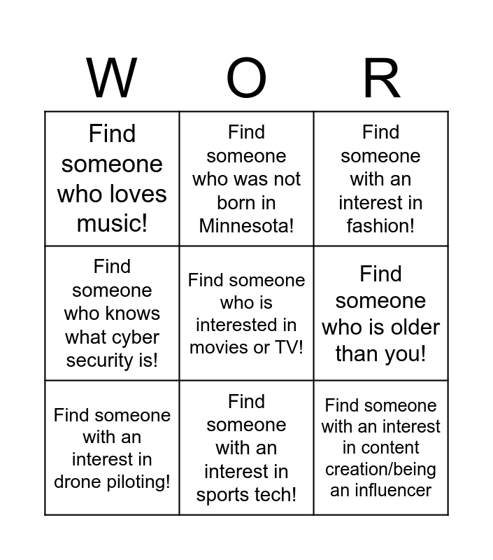 This bingo card has a free space and 8 words: Find someone who is older than you!, Find someone with an interest in fashion!, Find someone who was not born in Minnesota!, Find someone with an interest in drone piloting!, Find someone who loves music!, Find someone with an interest in content creation/being an influencer, Find someone who knows what cyber security is! and Find someone with an interest in sports tech!.