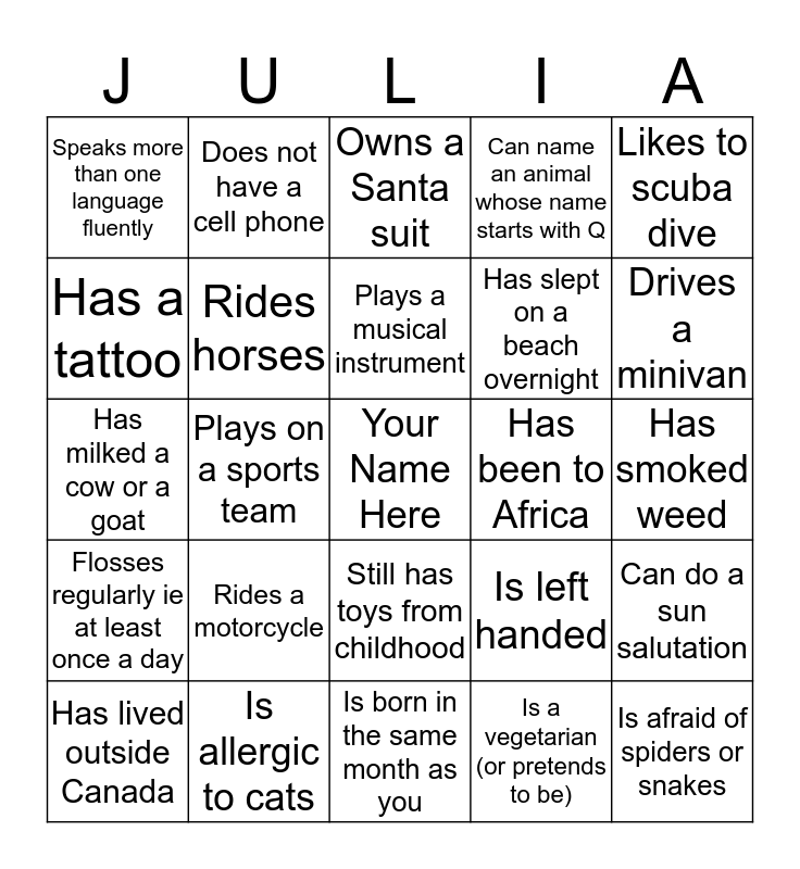 This bingo card has a free space and 24 words: Rides a motorcycle, Is allergic to cats, Plays a musical instrument, Has lived outside Canada, Likes to scuba dive, Speaks more than one language fluently, Has a tattoo, Does not have a cell phone, Has been to Africa, Still has toys from childhood, Has slept on a beach overnight, Has milked a cow or a goat, Is left handed, Can do a sun salutation, Rides horses, Is a vegetarian (or pretends to be), Has smoked weed, Owns a Santa suit, Drives a minivan, Plays on a sports team, Is afraid of spiders or snakes, Flosses regularly ie at least once a day, Can name an animal whose name starts with Q and Is born in the same month as you.