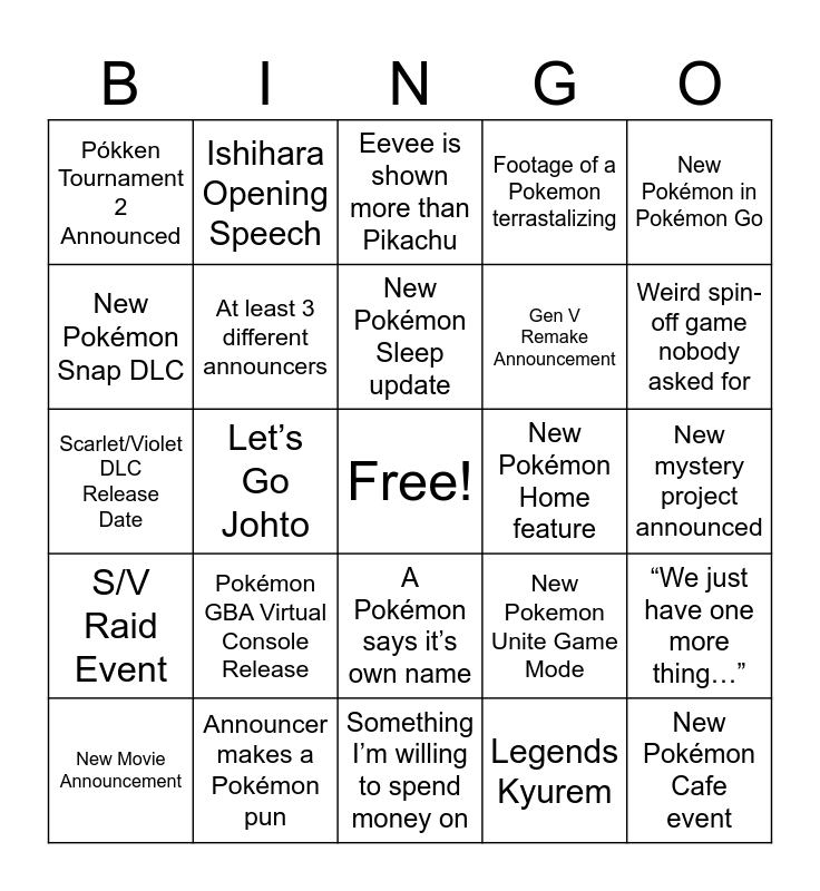 This bingo card has a free space and 24 words: Pokémon GBA Virtual Console Release, Announcer makes a Pokémon pun, New Pokémon Sleep update, New Movie Announcement, New Pokémon in Pokémon Go, Pókken Tournament 2 Announced, New Pokémon Snap DLC, Ishihara Opening Speech, New Pokémon Home feature, A Pokémon says it’s own name, Gen V Remake Announcement, Scarlet/Violet DLC Release Date, New Pokemon Unite Game Mode, “We just have one more thing…”, At least 3 different announcers, Legends Kyurem, New mystery project announced, Eevee is shown more than Pikachu, Weird spin-off game nobody asked for, Let’s Go Johto, New Pokémon Cafe event, S/V Raid Event, Footage of a Pokemon terrastalizing and Something I’m willing to spend money on.
