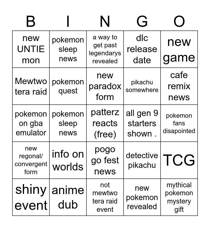 This bingo card has a free space and 24 words: info on worlds, anime dub, new paradox form, shiny event, new game, new UNTIE mon, Mewtwo tera raid, pokemon sleep news, all gen 9 starters shown ., pogo go fest news, pikachu somewhere, pokemon on gba emulator, detective pikachu, TCG, pokemon quest, new pokemon revealed, pokemon fans disapointed, a way to get past legendarys revealed, cafe remix news, pokemon sleep news, mythical pokemon mystery gift, new regonal/ convergent form, dlc release date and not mewtwo tera raid event.