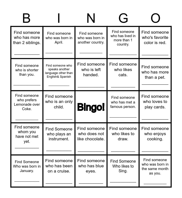 This bingo card has a free space and 25 words: Find Someone Who was born in January. ____________, Find Someone who plays an instrument. ___________, Find someone who is left handed. ___________, Find Someone Who likes to Sing. ____________, Find someone who has more than a pet. ___________, Find someone who has more than 2 siblings. ___________, Find someone who was born in April. _____________, Find someone who was born in another country. ___________, Find someone who likes cats. __________, Find someone who enjoys cooking. ___________, Find someone who prefers Lemonade over Coke. ___________, Find someone who speaks another language other than English& Spanish ____________, Find someone who likes to draw. __________, Find someone who was born in the same month as you. ___________, Find someone who is shorter than you. _____________, Find someone who has been on a cruise. ___________, Find someone who has blue eyes. __________, Find someone who has lived in more than 1 country. ______________, Find someone who loves to play cards. ___________, Find someone whom you have not met yet. ___________, Find someone who is an only child. ___________, Find someone who does not like chocolate. ___________, Find someone who has met a famous person. _____________, Find someone who's favorite color is red. ___________ and Find someone who is wearing a blue shirt. ____________.