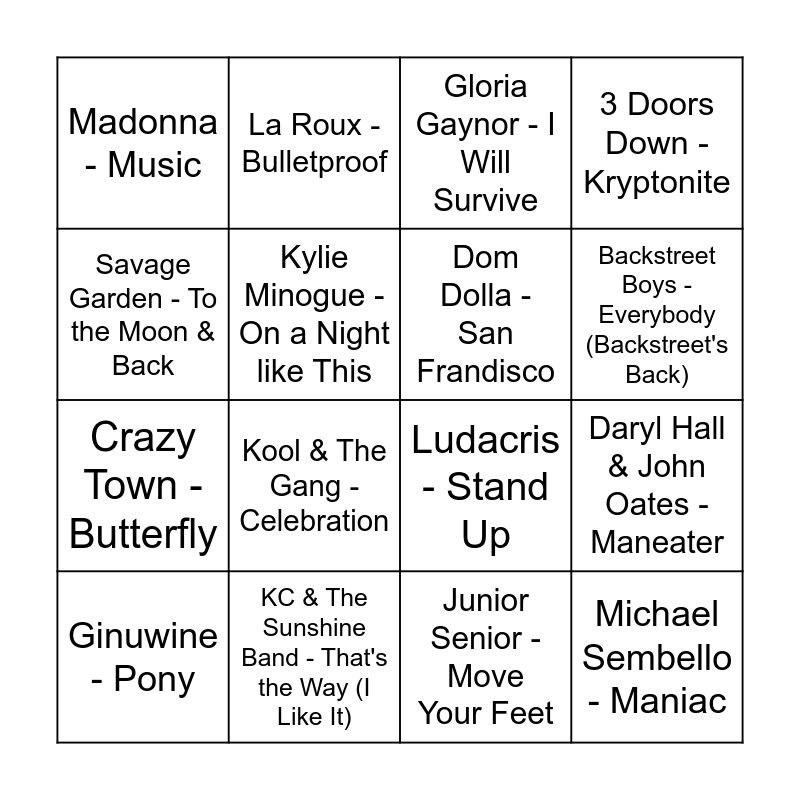 This bingo card has 60 words: Cutting Crew - (I Just) Died In Your Arms, Corey Hart - Sunglasses At Night, Kim Wilde - Kids In America, Michael Sembello - Maniac, Majestic - Rasputin, FISHER - Losing It, Dom Dolla - San Frandisco, Scribe - Not Many, Crazy Town - Butterfly, Jennifer Paige - Crush, 3 Doors Down - Kryptonite, Haddaway - What is Love, Kylie Minogue - On a Night like This, Rick Astley - Never Gonna Give You Up, Sophie Ellis-Bextor - Murder On The Dancefloor, Madonna - Music, Ginuwine - Pony, Savage Garden - To the Moon & Back, Daft Punk - One More Time, Backstreet Boys - Everybody (Backstreet's Back), KC & The Sunshine Band - That's the Way (I Like It), Gloria Gaynor - I Will Survive, DMX - Party Up, Jamelia - Superstar, No Doubt - Just A Girl, The Knack - My Sharona, Tiffany - I Think We're Alone Now, Bon Jovi - Livin' On A Prayer, Kool & The Gang - Celebration, Katrina & The Waves - Walking On Sunshine, Carl Douglas - Kung Fu Fighting, Starship - We Built This City, Peaches & Herb - Shake Your Groove Thing, Justice - D.A.N.C.E, La Roux - Bulletproof, Dua Lipa - Don't Start Now, Freestylers - Push Up, Daryl Hall & John Oates - Maneater, The Who - Baba O'Riley, Ludacris - Stand Up, Big Brovaz - Nu Flow, Sean Paul - Get Busy, Junior Senior - Move Your Feet, t.A.T.u. - All The Things She Said, Snoop Dogg - Beautiful, Lil Jon & The East Side Boyz - Get Low, Nelly - Shake Ya Tailfeather, Ja Rule - Mesmerize, 50 Cent - P.I.M.P., Elvis Presley/JXL - A Little Less Conversation, DJ Sammy - Heaven, Fat Joe - What's Luv?, Bonnie Tyler - Holding Out for a Hero, Ricky Martin - Livin' la Vida Loca, Imagine Dragons - Believer, CHVRCHES - Clearest Blue, Corona - The Rhythm of the Night, Troye Sivan - Rush, Fall Out Boy - Sugar, We're Goin Down and The Hooters - And We Danced.